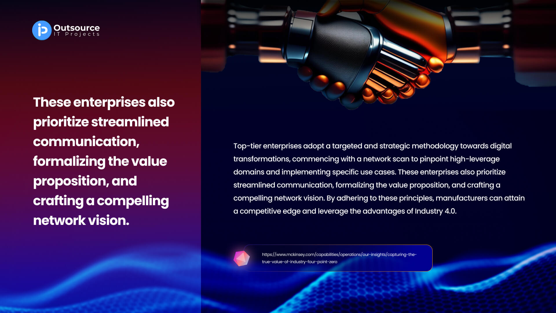 Top-tier enterprises adopt a targeted and strategic methodology towards digital transformations, commencing with a network scan to pinpoint high-leverage domains and implementing specific use cases. These enterprises also prioritize streamlined communication, formalizing the value proposition, and crafting a compelling network vision. By adhering to these principles, manufacturers can attain a competitive edge and leverage the advantages of Industry 4.0.