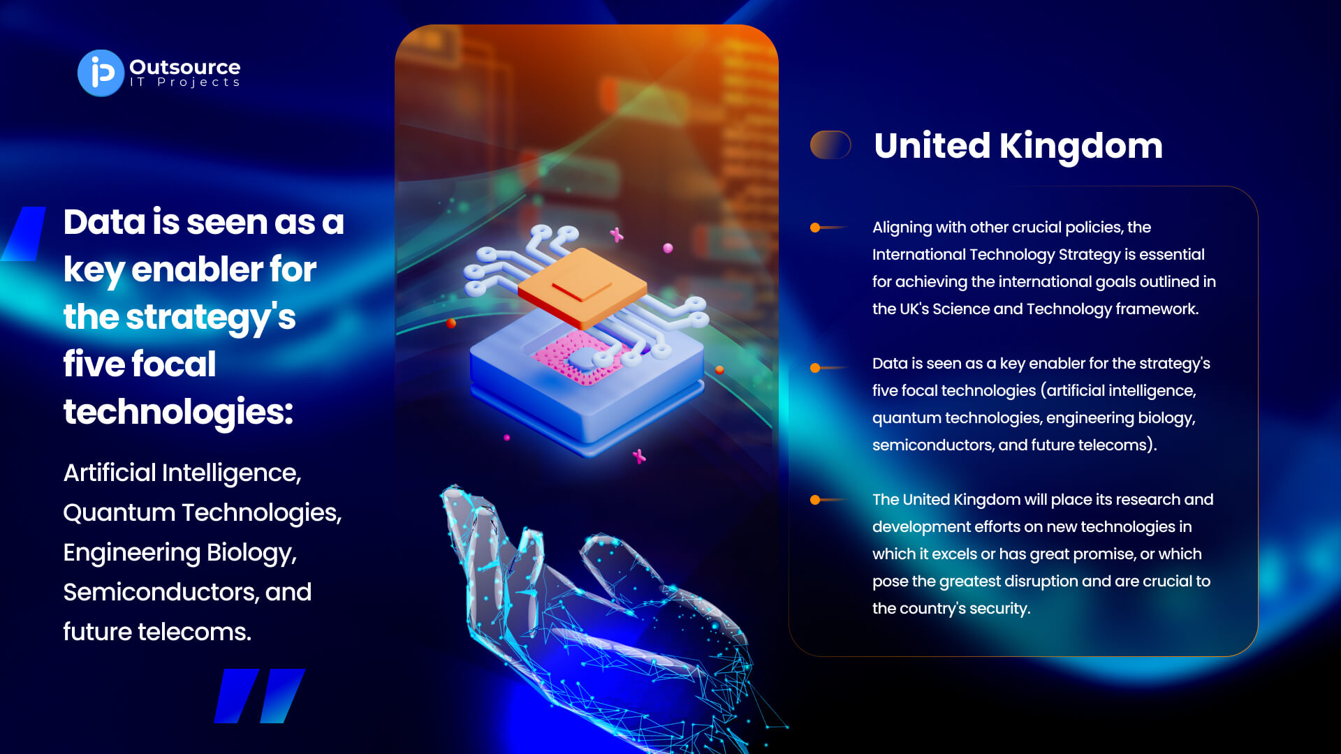 Data is seen as a key enabler for the strategy's five focal technologies (artificial intelligence, quantum technologies, engineering biology, semiconductors, and future telecoms).