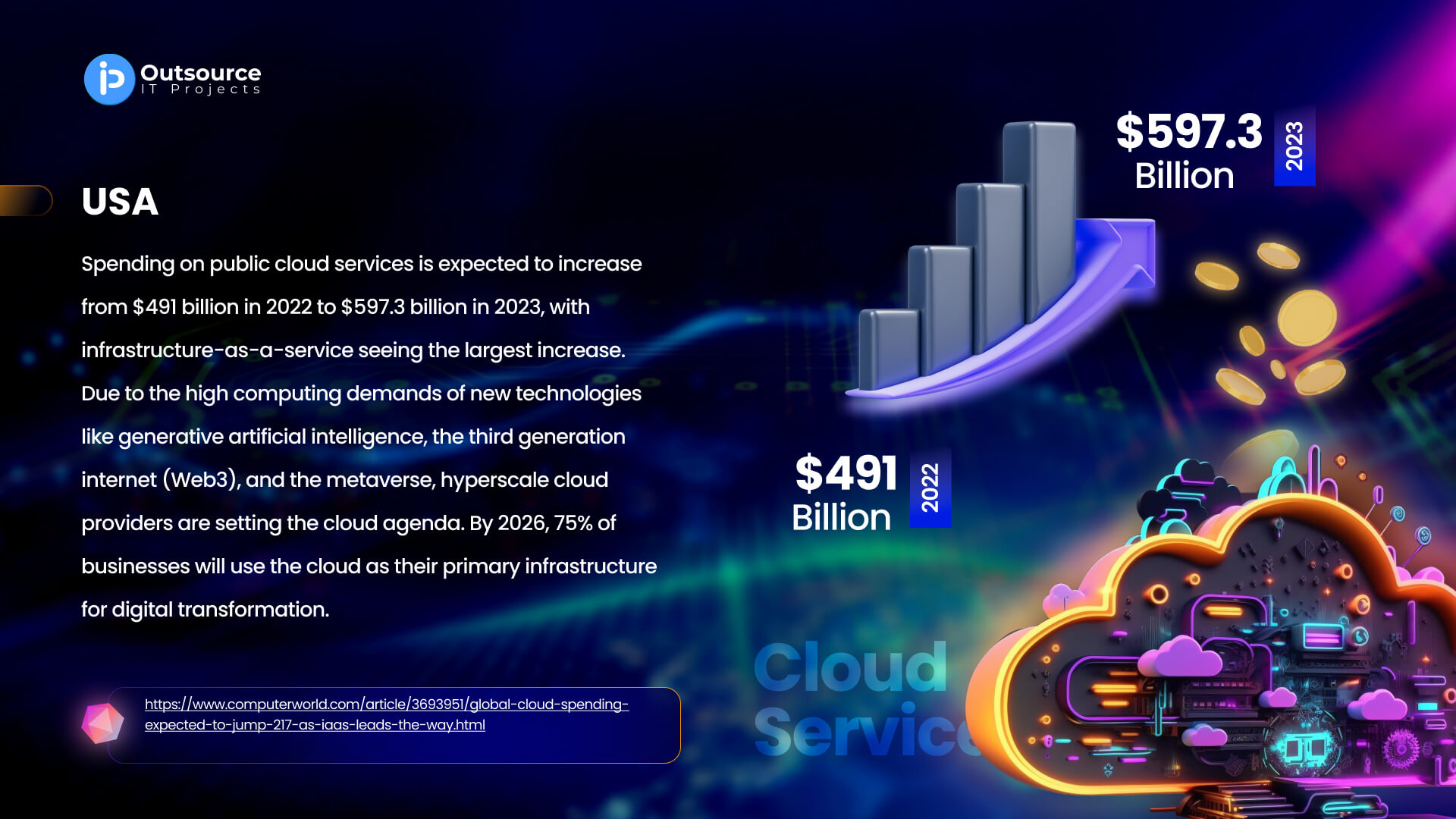 Spending on public cloud services is expected to increase from $491 billion in 2022 to $597.3 billion in 2023, with infrastructure-as-a-service seeing the largest increase. Due to the high computing demands of new technologies like generative artificial intelligence, the third generation internet (Web3), and the metaverse, hyperscale cloud providers are setting the cloud agenda. By 2026, 75% of businesses will use the cloud as their primary infrastructure for digital transformation. (Please add infographics)