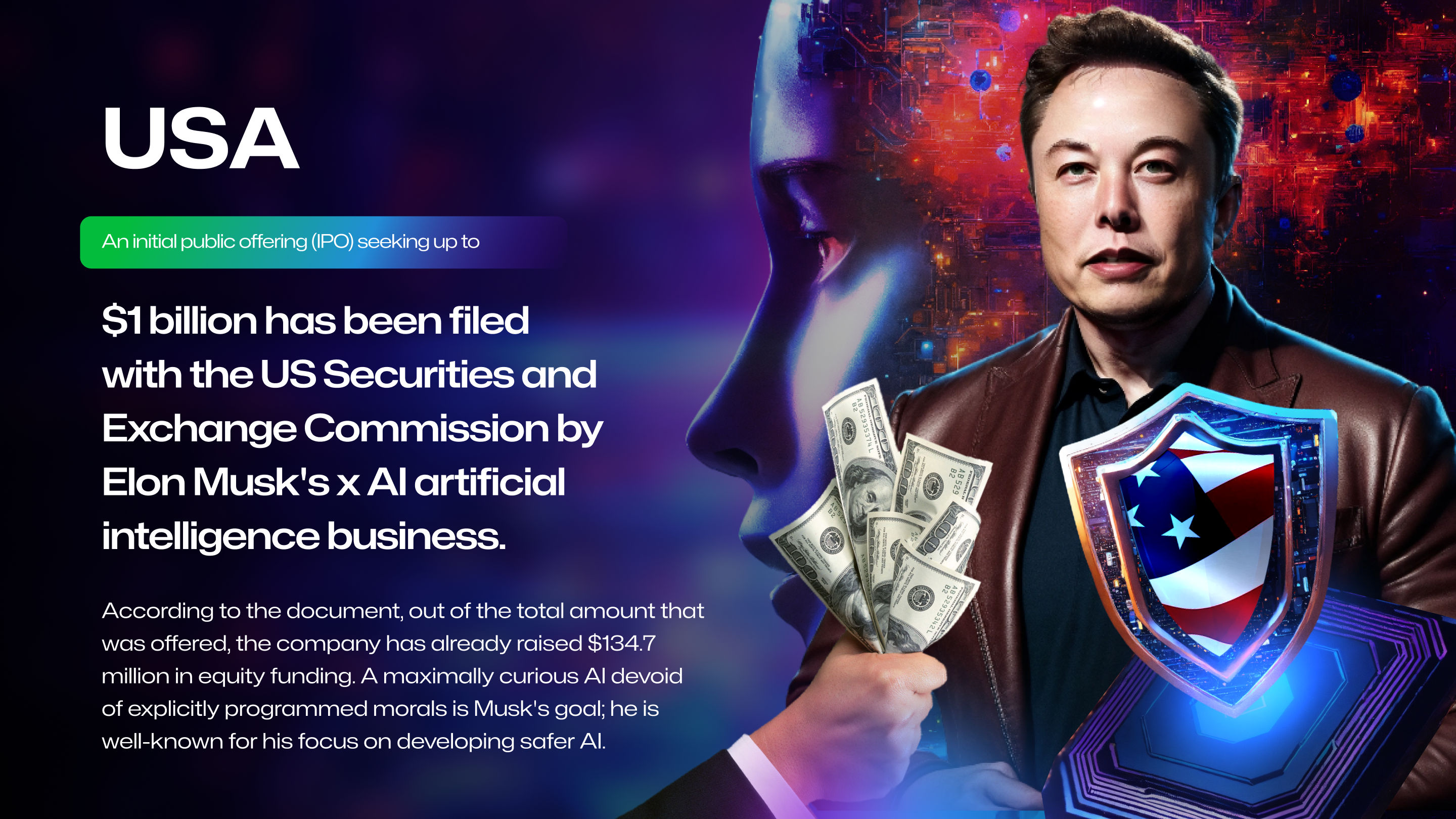 An initial public offering (IPO) seeking up to $1 billion has been filed with the US Securities and Exchange Commission by Elon Musk's xAI artificial intelligence business. According to the document, out of the total amount that was offered, the company has already raised $134.7 million in equity funding. A maximally curious AI devoid of explicitly programmed morals is Musk's goal; he is well-known for his focus on developing safer AI.