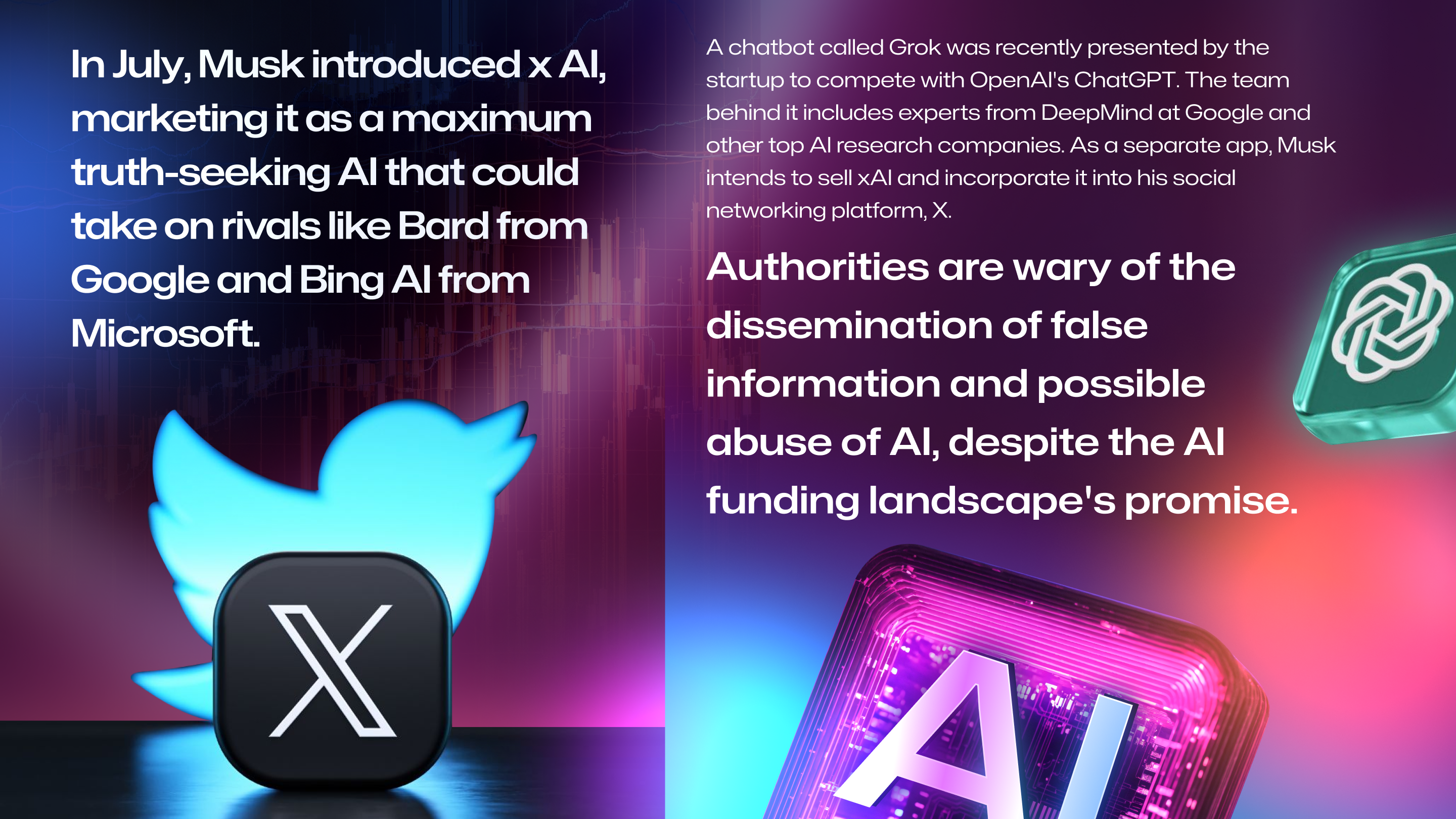 In July, Musk introduced xAI, marketing it as a maximum truth-seeking AI that could take on rivals like Bard from Google and Bing AI from Microsoft. A chatbot called Grok was recently presented by the startup to compete with OpenAI's ChatGPT. The team behind it includes experts from DeepMind at Google and other top AI research companies. As a separate app, Musk intends to sell xAI and incorporate it into his social networking platform, X.