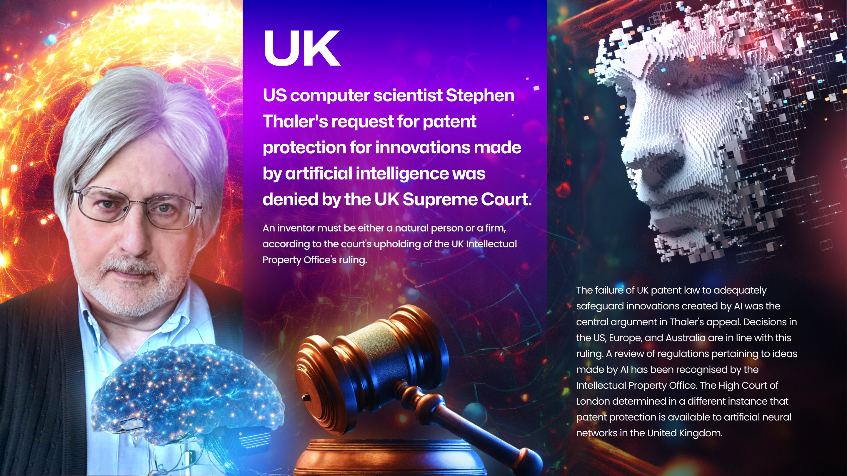US computer scientist Stephen Thaler's request for patent protection for innovations made by artificial intelligence was denied by the UK Supreme Court. An inventor must be either a natural person or a firm, according to the court's upholding of the UK Intellectual Property Office's ruling.