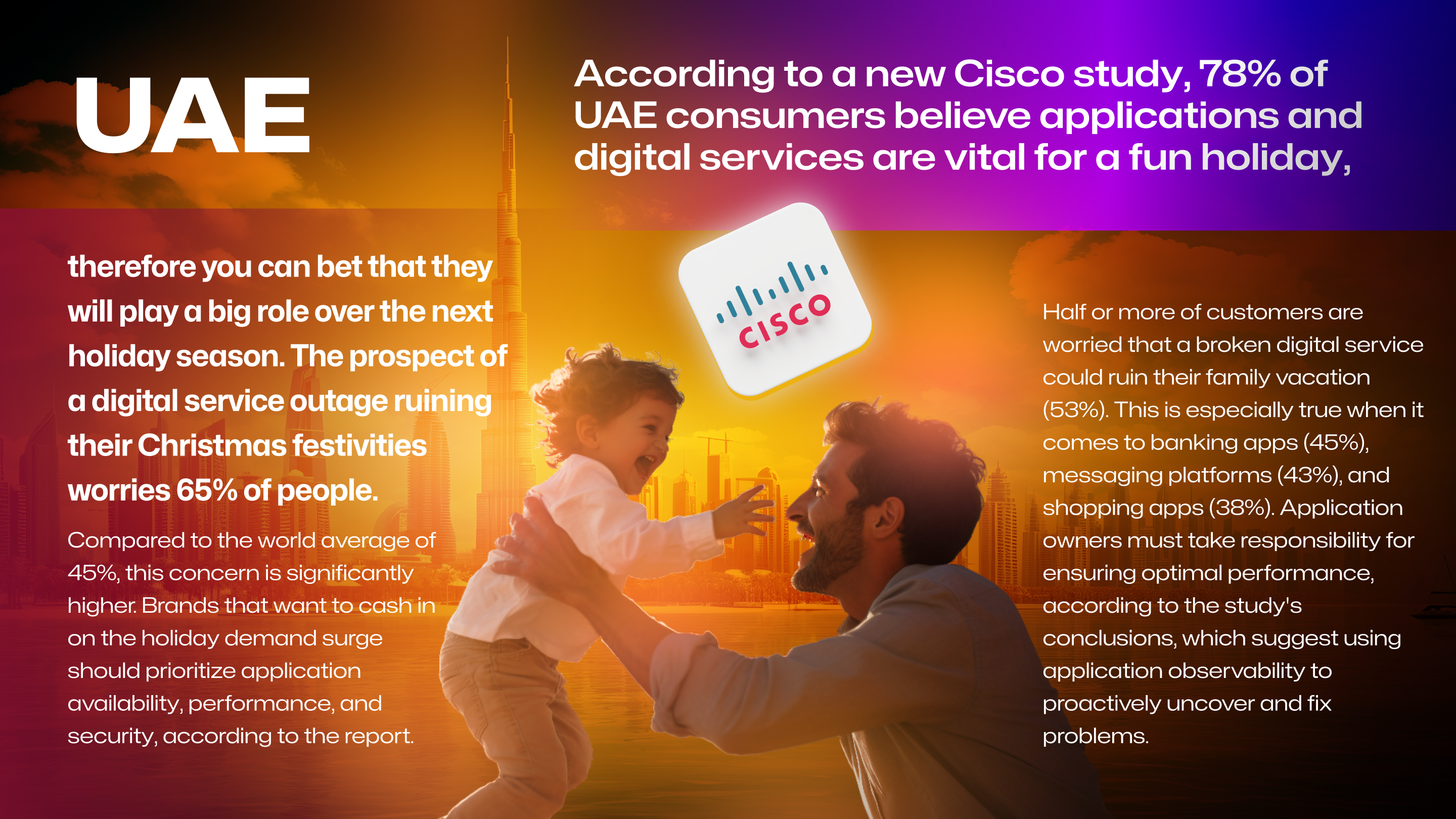 According to a new Cisco study, 78% of UAE consumers believe applications and digital services are vital for a fun holiday, therefore you can bet that they will play a big role over the next holiday season. The prospect of a digital service outage ruining their Christmas festivities worries 65% of people. Compared to the world average of 45%, this concern is significantly higher. Brands that want to cash in on the holiday demand surge should prioritize application availability, performance, and security, according to the report. Half or more of customers are worried that a broken digital service could ruin their family vacation (53%). This is especially true when it comes to banking apps (45%), messaging platforms (43%), and shopping apps (38%). Application owners must take responsibility for ensuring optimal performance, according to the study's conclusions, which suggest using application observability to proactively uncover and fix problems.