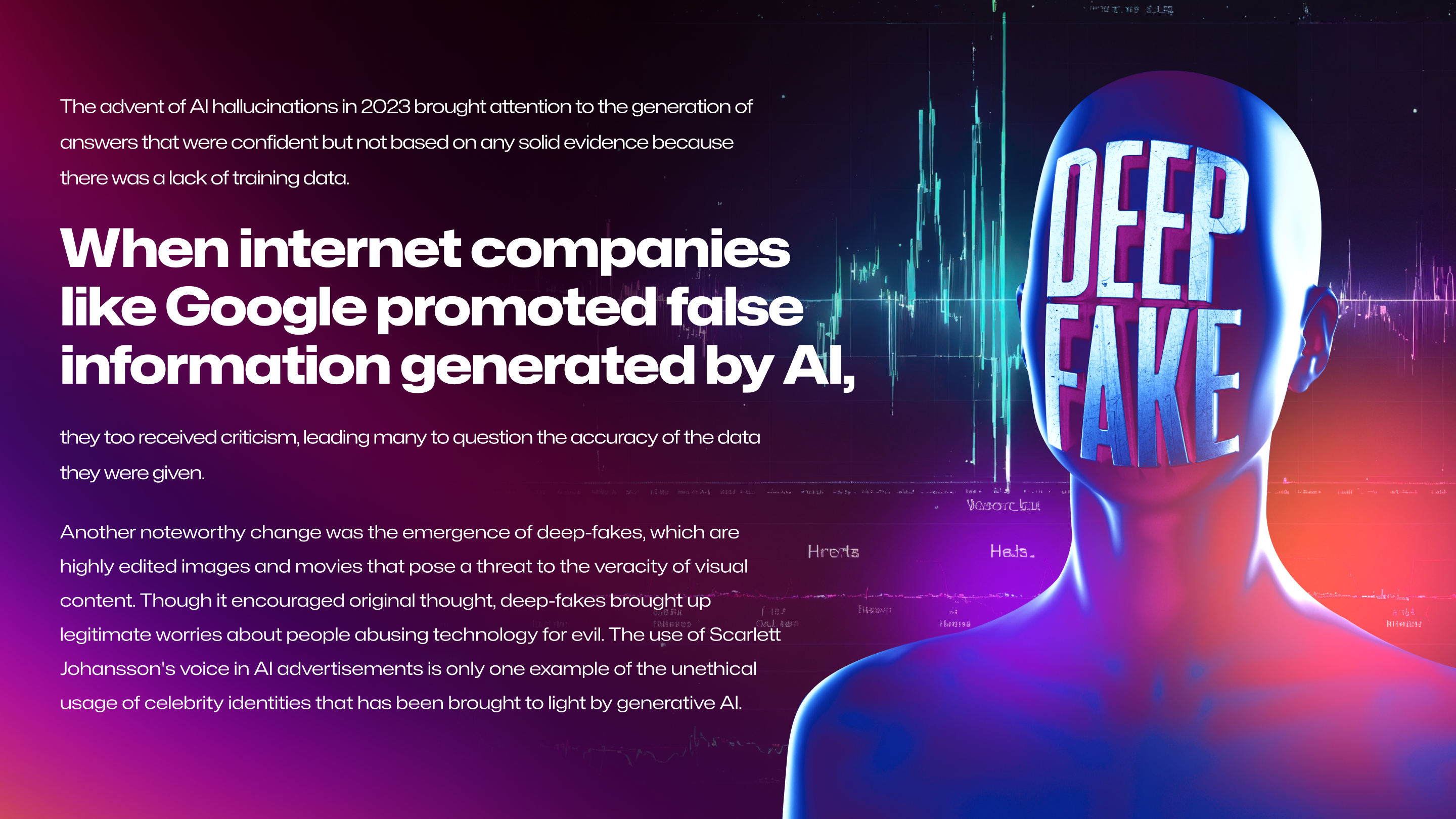Another noteworthy change was the emergence of deep-fakes, which are highly edited images and movies that pose a threat to the veracity of visual content. Though it encouraged original thought, deep-fakes brought up legitimate worries about people abusing technology for evil. The use of Scarlett Johansson's voice in AI advertisements is only one example of the unethical usage of celebrity identities that has been brought to light by generative AI.