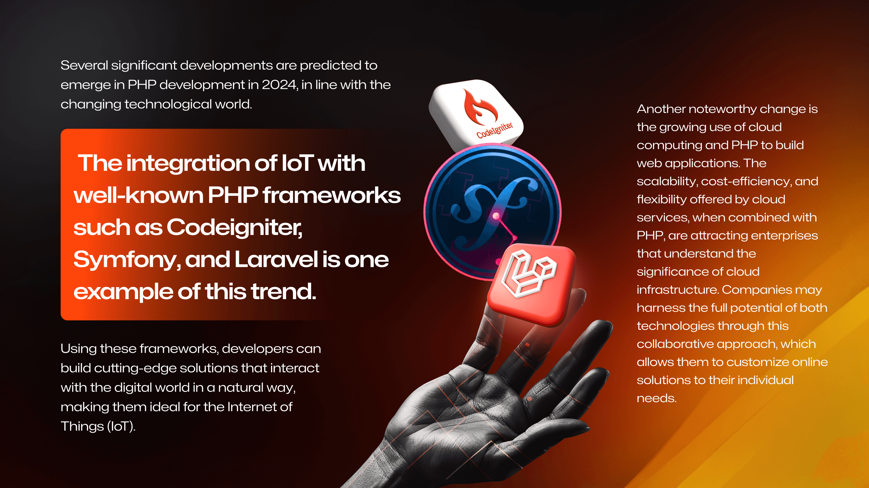 - Several significant developments are predicted to emerge in PHP development in 2024, in line with the changing technological world. The integration of IoT with well-known PHP frameworks such as Codeigniter, Symfony, and Laravel is one example of this trend. Using these frameworks, developers can build cutting-edge solutions that interact with the digital world in a natural way, making them ideal for the Internet of Things (IoT).