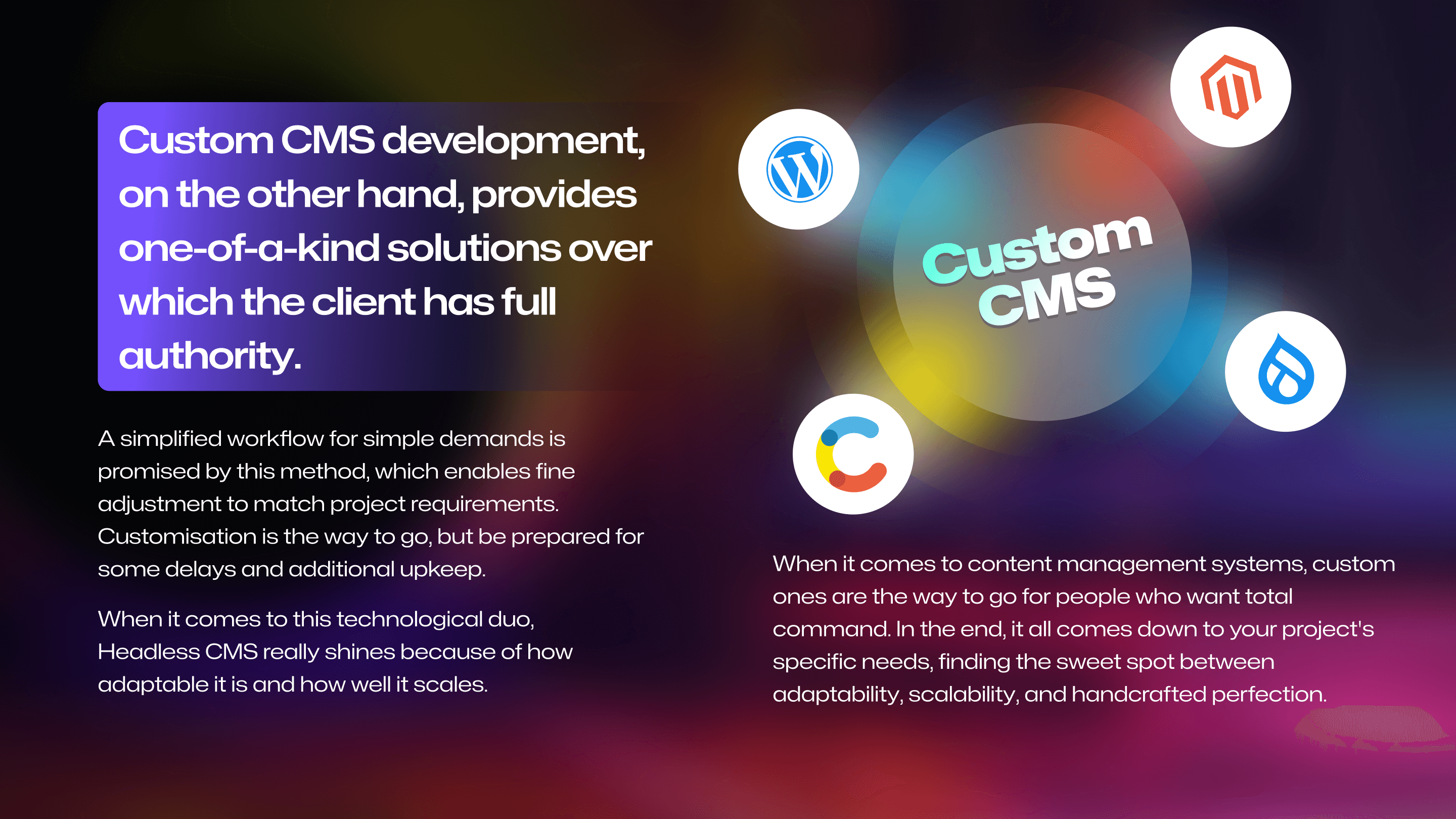 When it comes to this technological duo, Headless CMS really shines because of how adaptable it is and how well it scales. When it comes to content management systems, custom ones are the way to go for people who want total command. In the end, it all comes down to your project's specific needs, finding the sweet spot between adaptability, scalability, and handcrafted perfection.