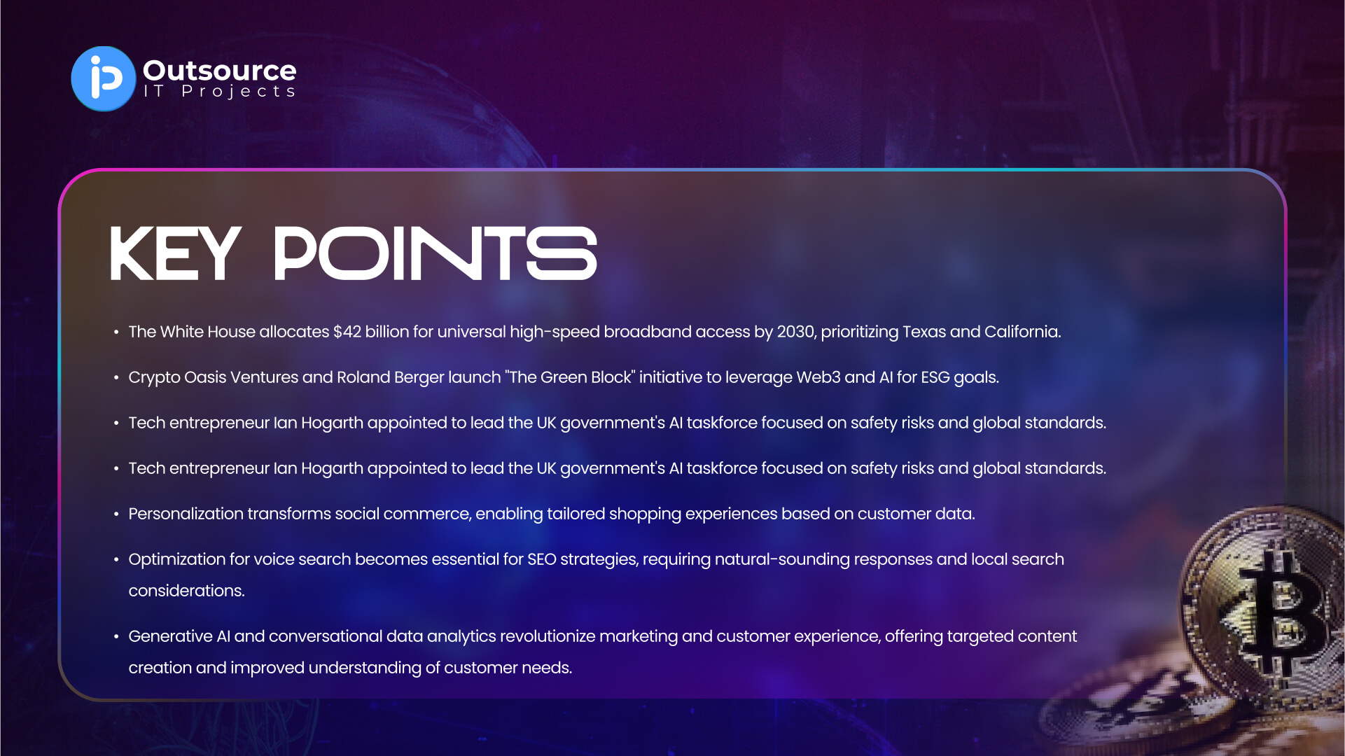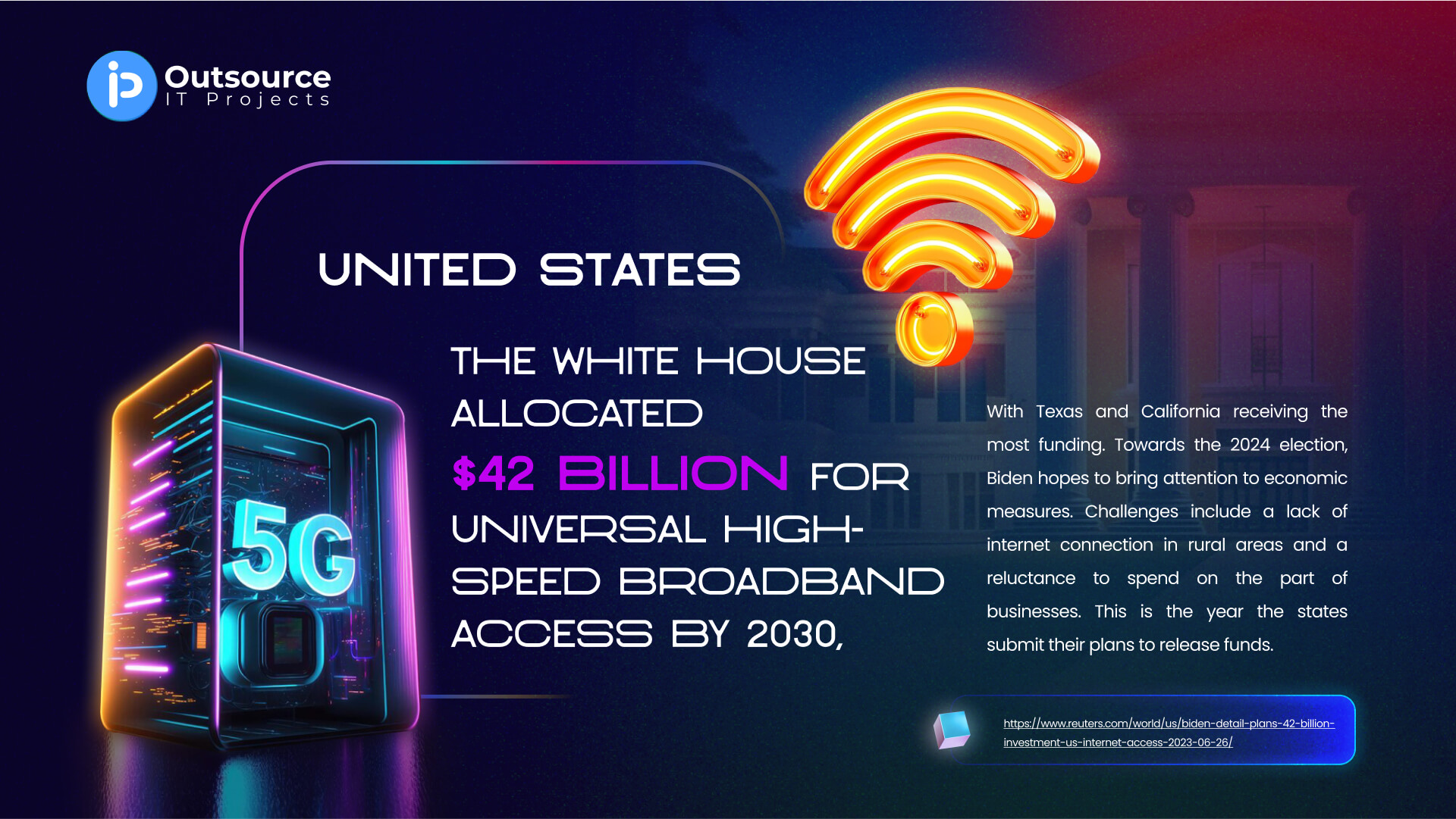 - The White House allocates $42 billion for universal high-speed broadband access by 2030, prioritizing Texas and California.