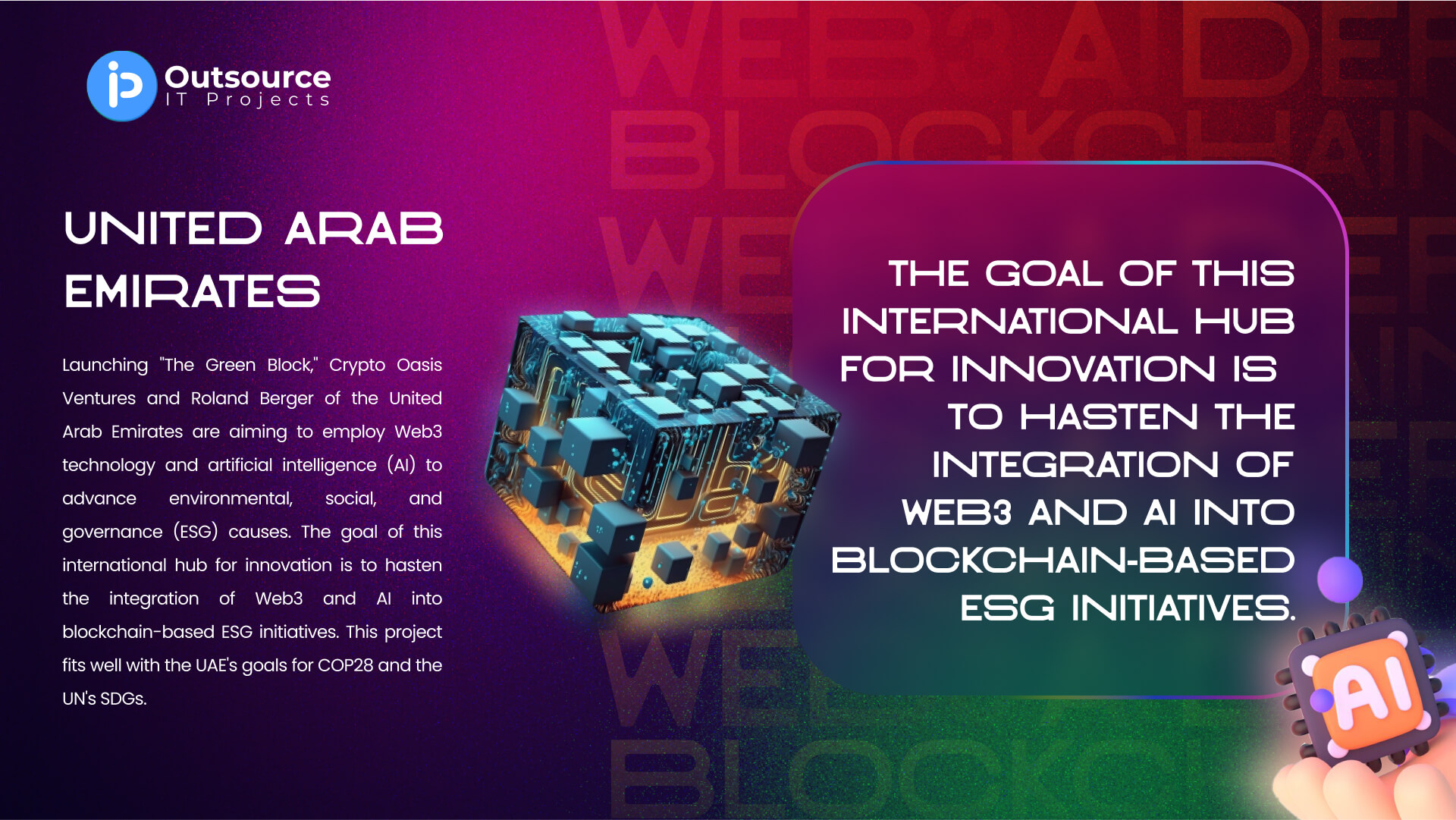 Launching "The Green Block," Crypto Oasis Ventures and Roland Berger of the United Arab Emirates are aiming to employ Web3 technology and artificial intelligence (AI) to advance environmental, social, and governance (ESG) causes. The goal of this international hub for innovation is to hasten the integration of Web3 and AI into blockchain-based ESG initiatives. This project fits well with the UAE's goals for COP28 and the UN's SDGs.