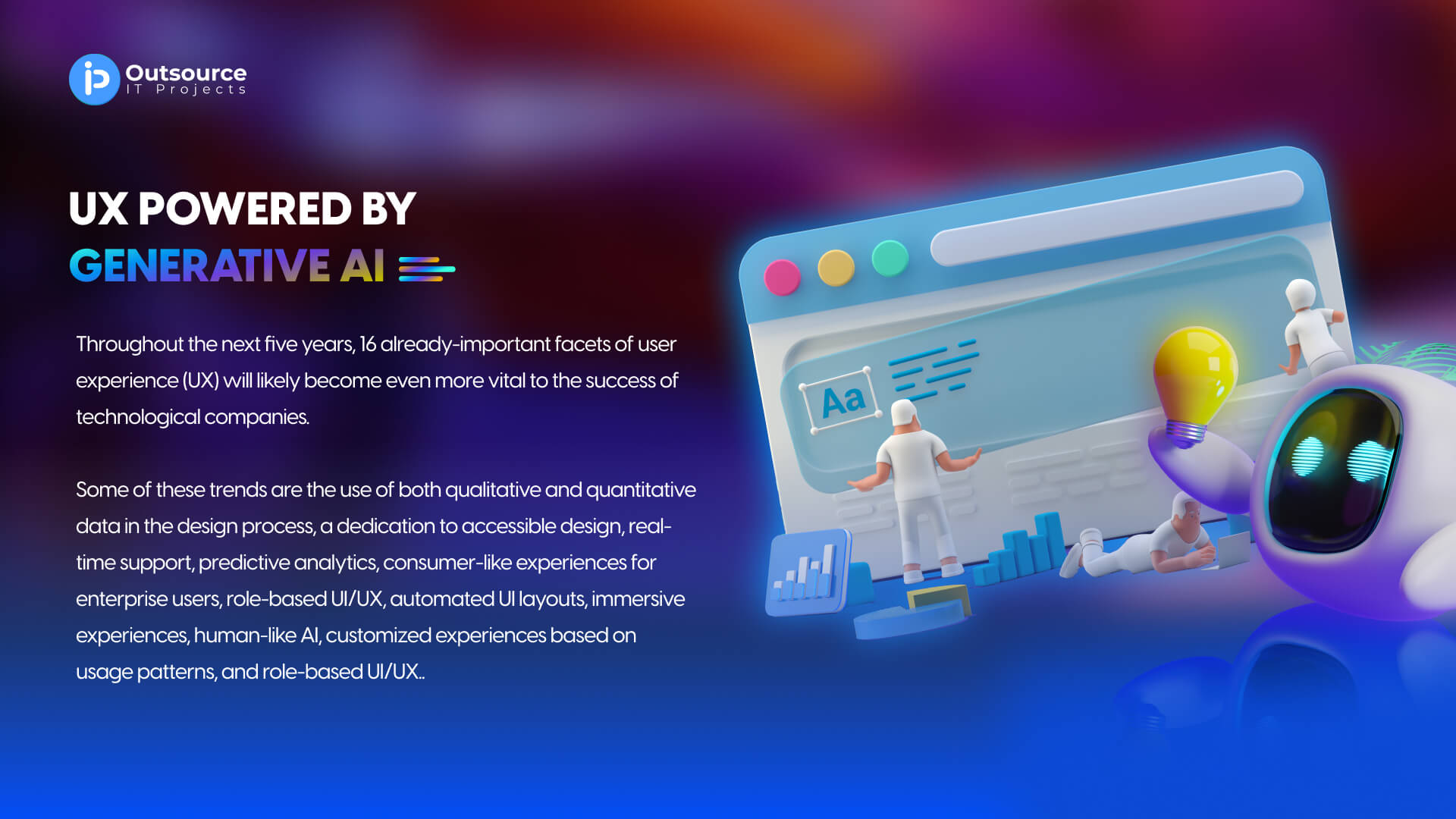 Some of these trends are the use of both qualitative and quantitative data in the design process, a dedication to accessible design, real-time support, predictive analytics, consumer-like experiences for enterprise users, role-based UI/UX, automated UI layouts, immersive experiences, human-like AI, customized experiences based on usage patterns, and role-based UI/UX.
