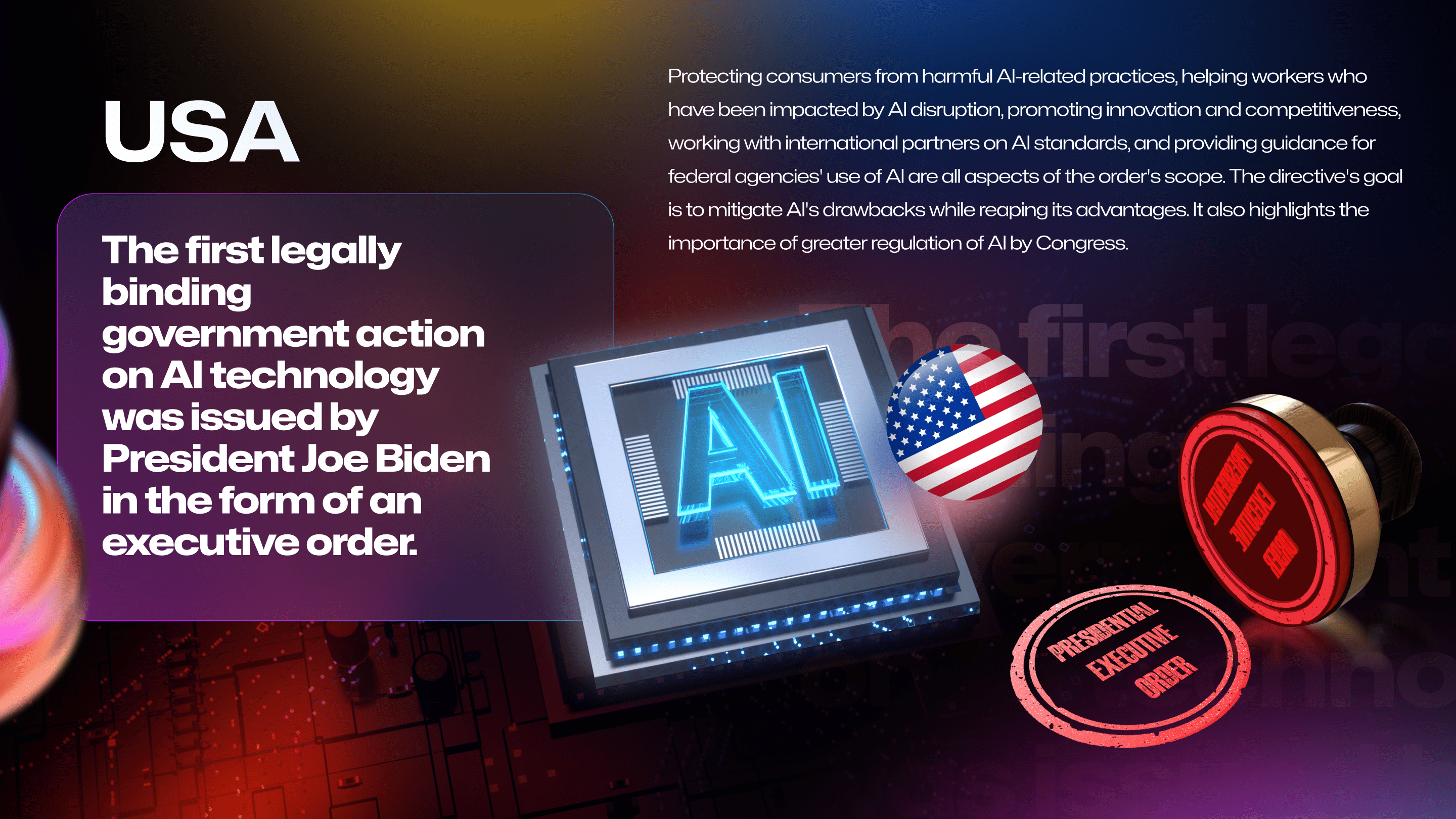 The first legally binding government action on AI technology was issued by President Joe Biden in the form of an executive order. Protecting consumers from harmful AI-related practices, helping workers who have been impacted by AI disruption, promoting innovation and competitiveness, working with international partners on AI standards, and providing guidance for federal agencies' use of AI are all aspects of the order's scope. The directive's goal is to mitigate AI's drawbacks while reaping its advantages. It also highlights the importance of greater regulation of AI by Congress.