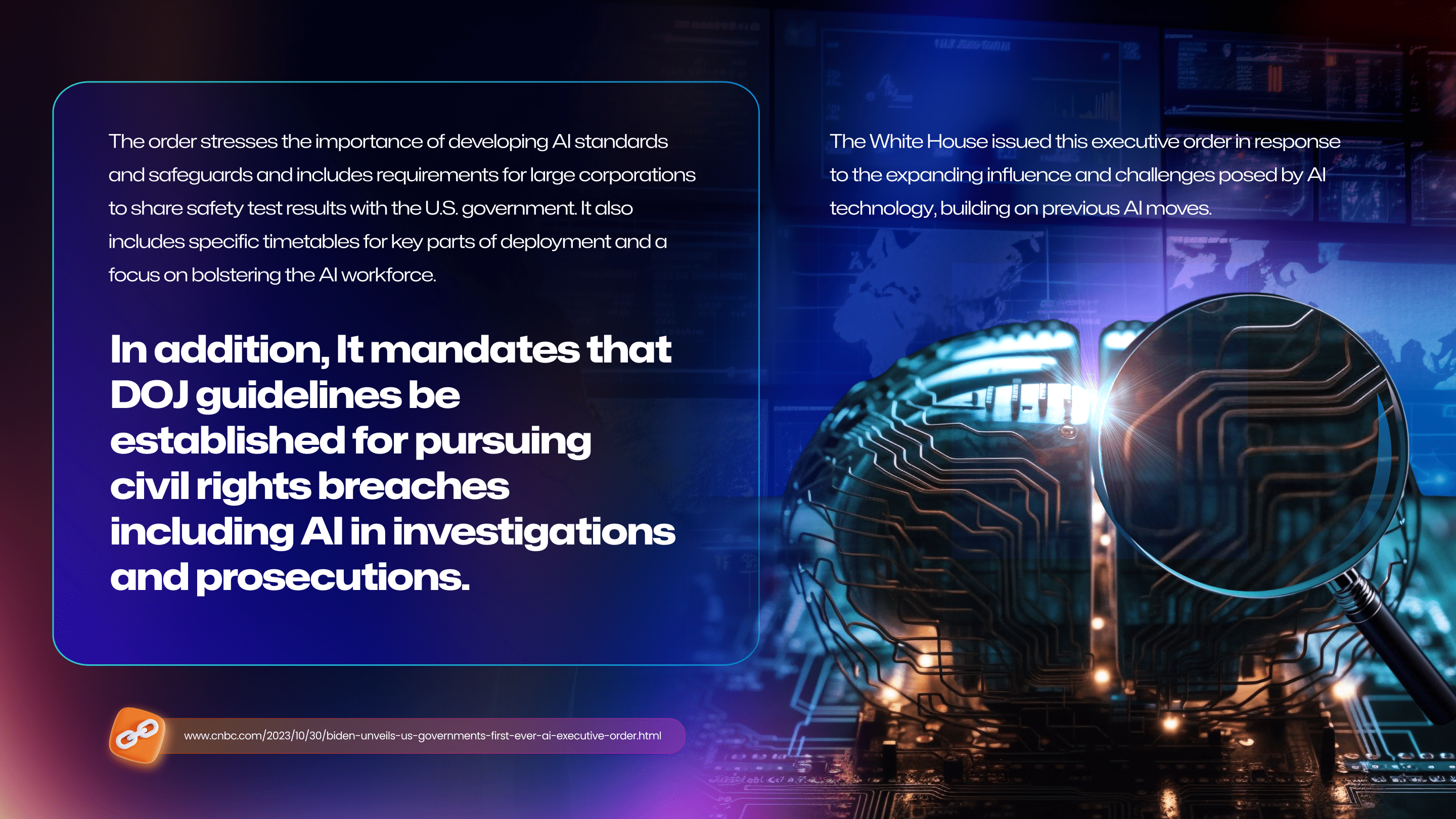 The order stresses the importance of developing AI standards and safeguards and includes requirements for large corporations to share safety test results with the U.S. government. It also includes specific timetables for key parts of deployment and a focus on bolstering the AI workforce. In addition, it mandates that DOJ guidelines be established for pursuing civil rights breaches including AI in investigations and prosecutions. The White House issued this executive order in response to the expanding influence and challenges posed by AI technology, building on previous AI moves.