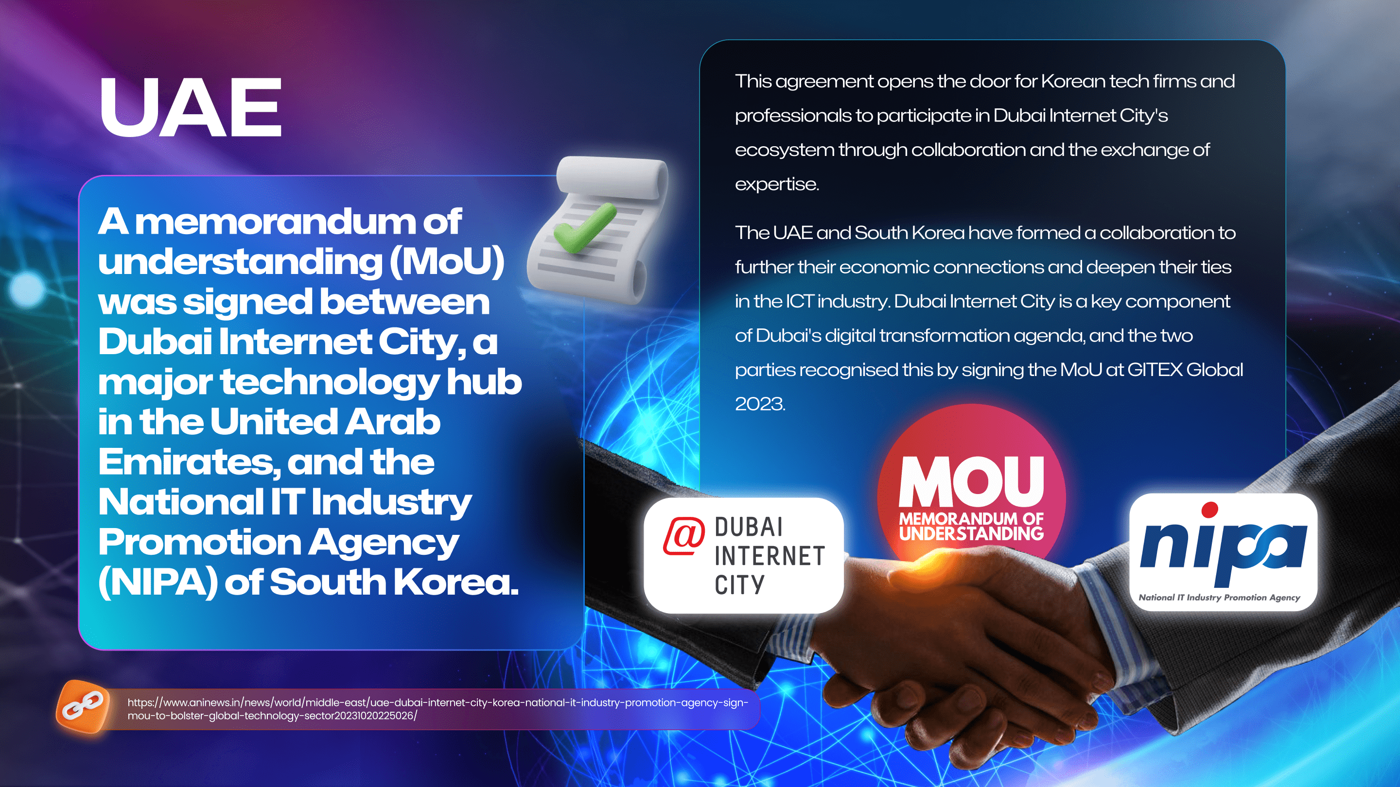 - A memorandum of understanding (MoU) was signed between Dubai Internet City and the National IT Industry Promotion Agency (NIPA) of South Korea to foster cooperation in the IT industry.