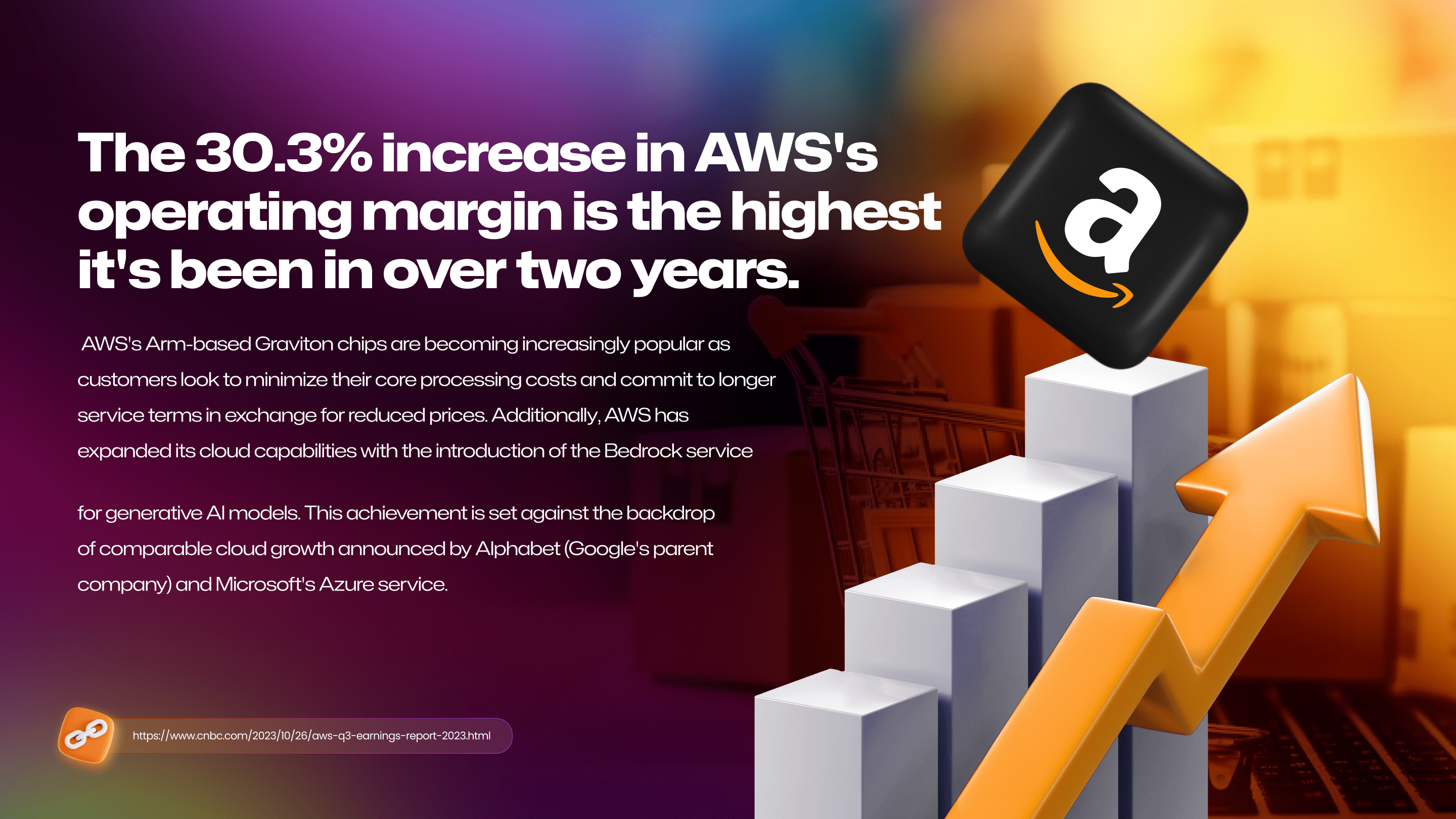 The 30.3% increase in AWS's operating margin is the highest it's been in over two years. AWS's Arm-based Graviton chips are becoming increasingly popular as customers look to minimize their core processing costs and commit to longer service terms in exchange for reduced prices. Additionally, AWS has expanded its cloud capabilities with the introduction of the Bedrock service for generative AI models. This achievement is set against the backdrop of comparable cloud growth announced by Alphabet (Google's parent company) and Microsoft's Azure service.