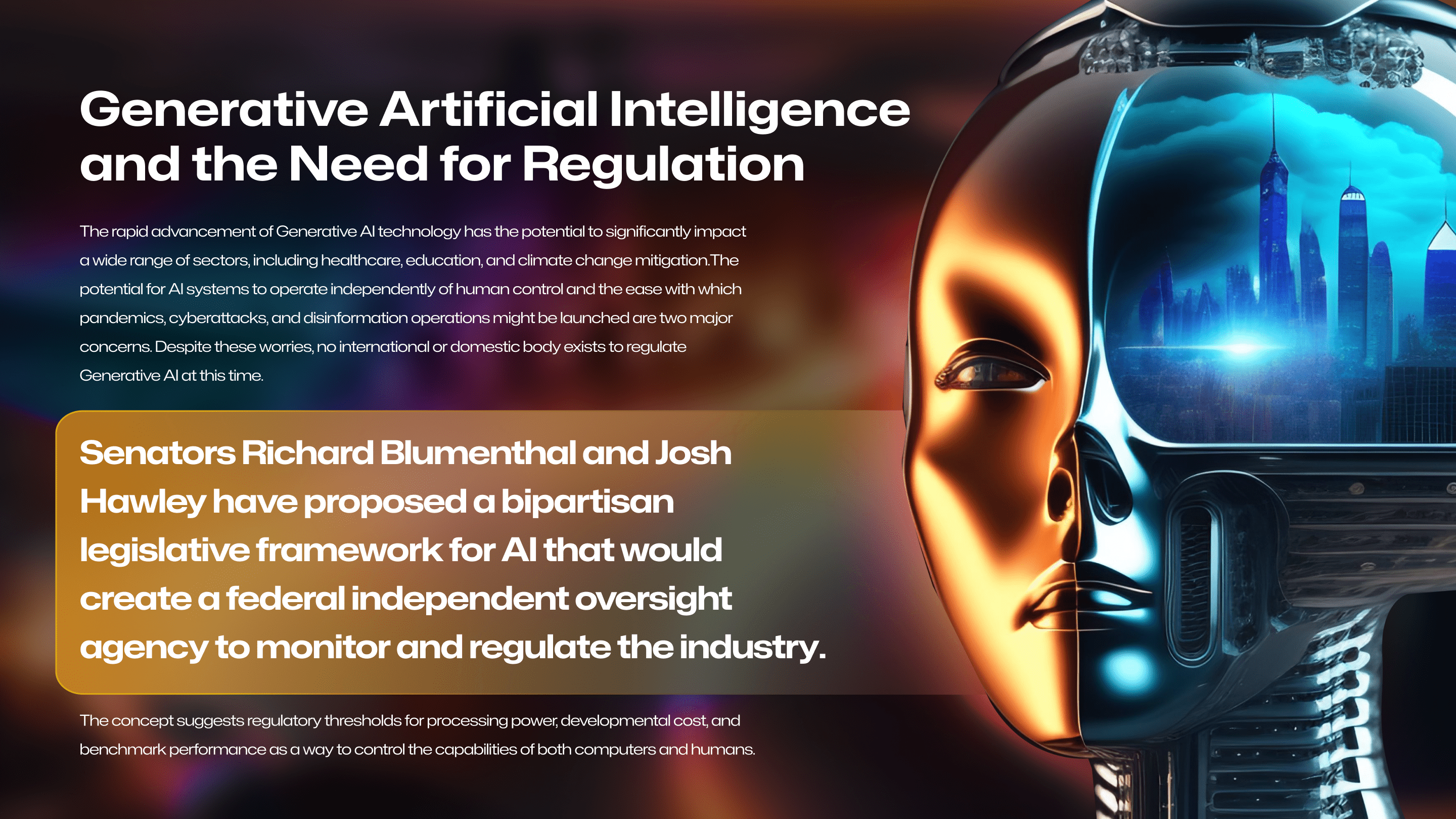 The rapid advancement of Generative AI technology has the potential to significantly impact a wide range of sectors, including healthcare, education, and climate change mitigation.The potential for AI systems to operate independently of human control and the ease with which pandemics, cyberattacks, and disinformation operations might be launched are two major concerns. Despite these worries, no international or domestic body exists to regulate Generative AI at this time. Senators Richard Blumenthal and Josh Hawley have proposed a bipartisan legislative framework for AI that would create a federal independent oversight agency to monitor and regulate the industry. The concept suggests regulatory thresholds for processing power, developmental cost, and benchmark performance as a way to control the capabilities of both computers and humans.
