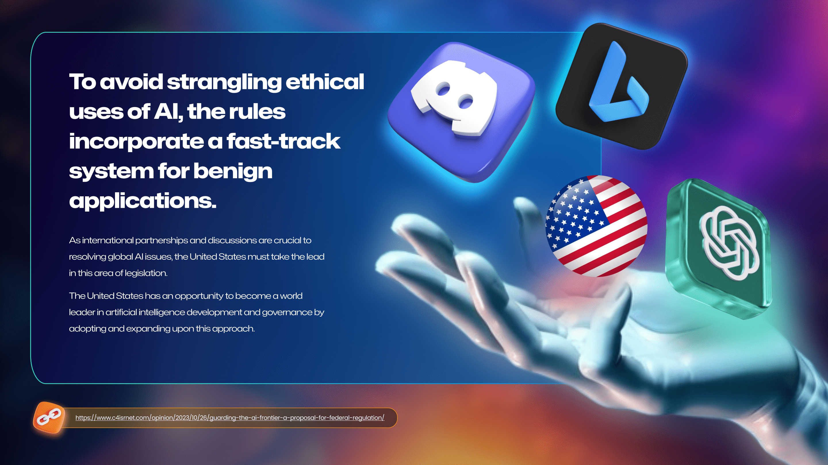 To avoid strangling ethical uses of AI, the rules incorporate a fast-track system for benign applications. As international partnerships and discussions are crucial to resolving global AI issues, the United States must take the lead in this area of legislation. The United States has an opportunity to become a world leader in artificial intelligence development and governance by adopting and expanding upon this approach.
