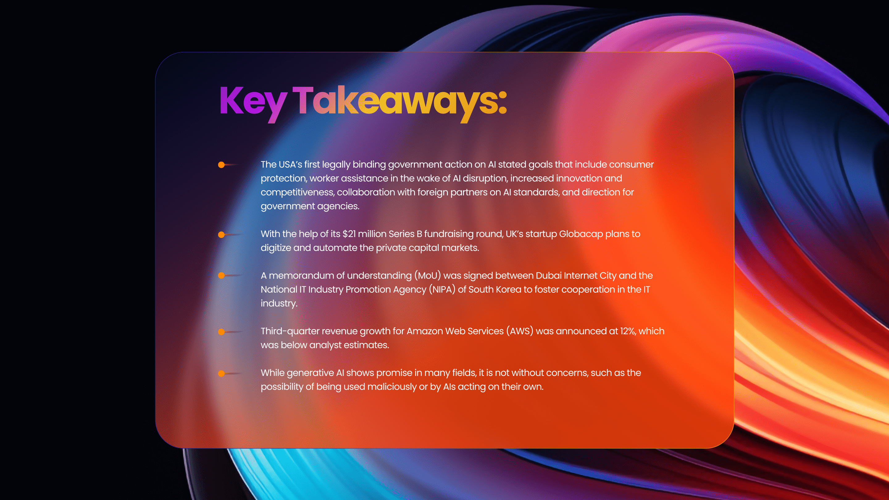 - The USA’s first legally binding government action on AI stated goals that include consumer protection, worker assistance in the wake of AI disruption, increased innovation and competitiveness, collaboration with foreign partners on AI standards, and direction for government agencies.