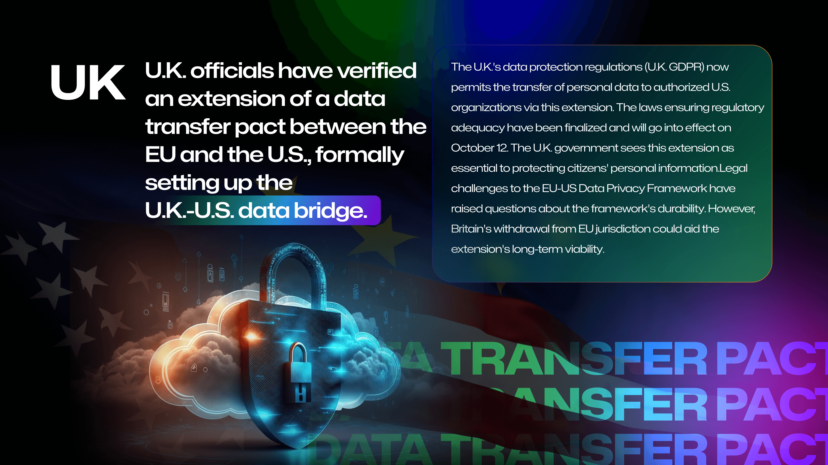 - The UK government has extended a data transfer deal with the EU and the US, creating the "UK-U.S. data bridge; this extension allows UK businesses to transfer personal data to certified US organizations while adhering to UK data protection regulations (UK GDPR).
