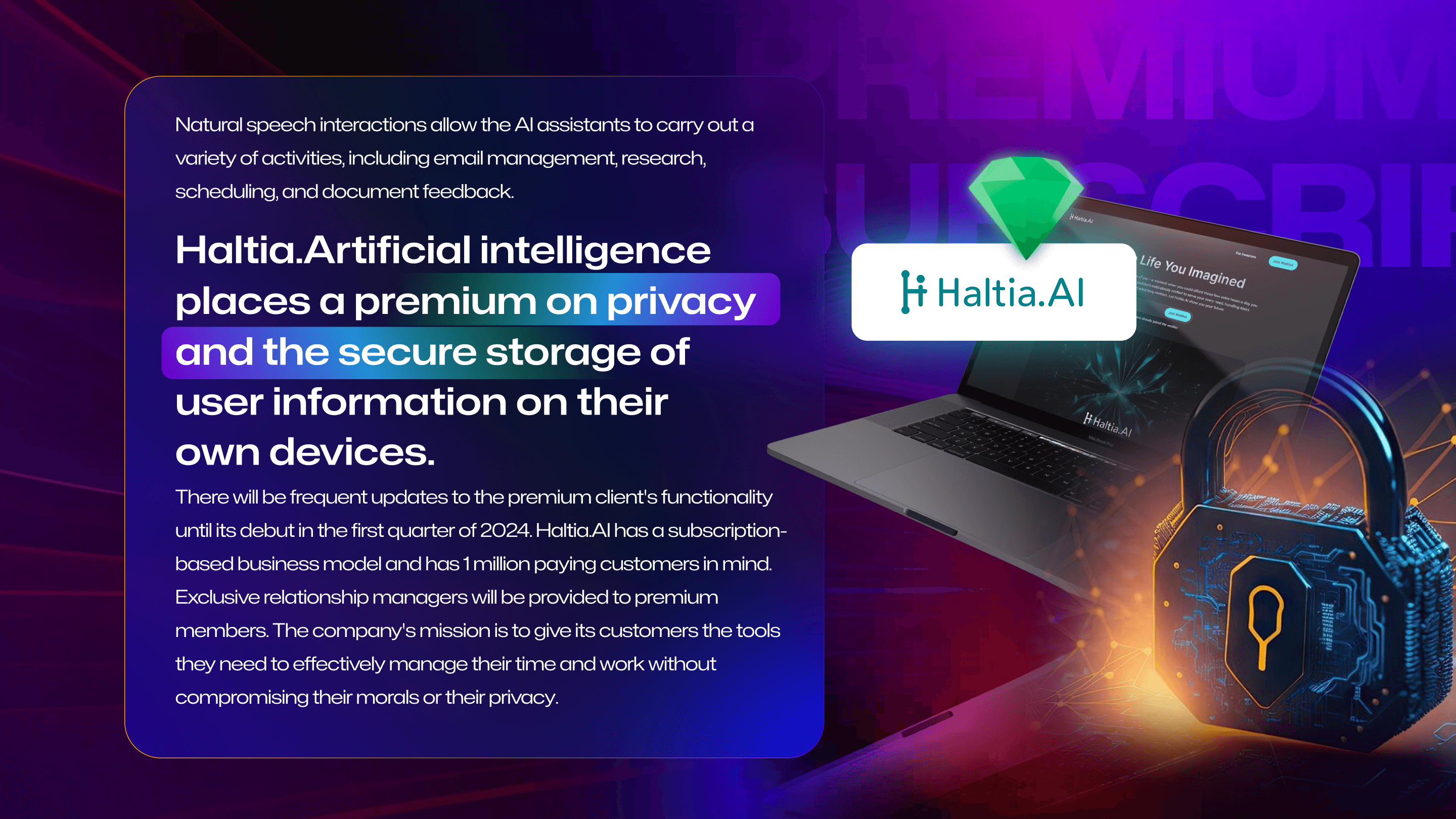 There will be frequent updates to the premium client's functionality until its debut in the first quarter of 2024. Haltia.AI has a subscription-based business model and has 1 million paying customers in mind. Exclusive relationship managers will be provided to premium members. The company's mission is to give its customers the tools they need to effectively manage their time and work without compromising their morals or their privacy.