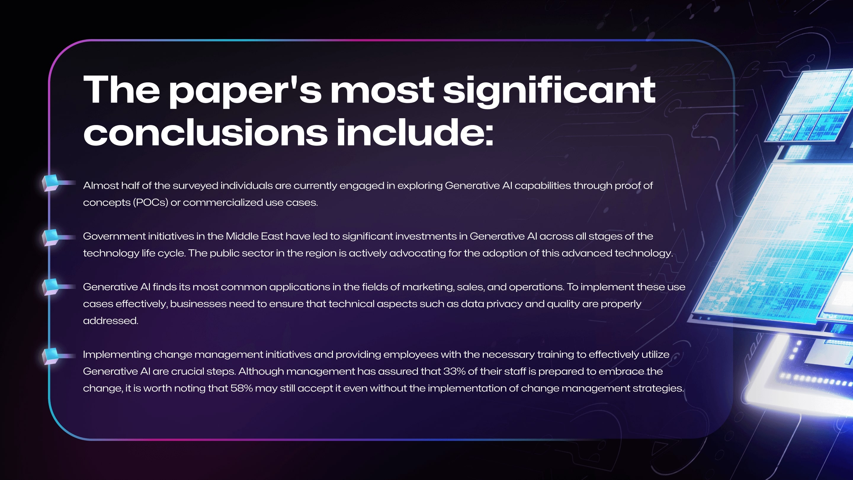 - Government initiatives in the Middle East have led to significant investments in Generative AI across all stages of the technology life cycle. The public sector in the region is actively advocating for the adoption of this advanced technology.