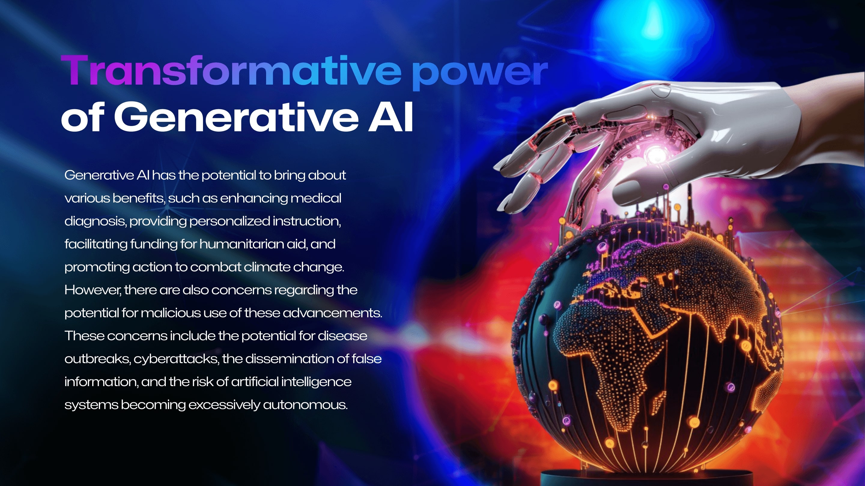 Generative AI has the potential to bring about various benefits, such as enhancing medical diagnosis, providing personalized instruction, facilitating funding for humanitarian aid, and promoting action to combat climate change. However, there are also concerns regarding the potential for malicious use of these advancements. These concerns include the potential for disease outbreaks, cyberattacks, the dissemination of false information, and the risk of artificial intelligence systems becoming excessively autonomous.