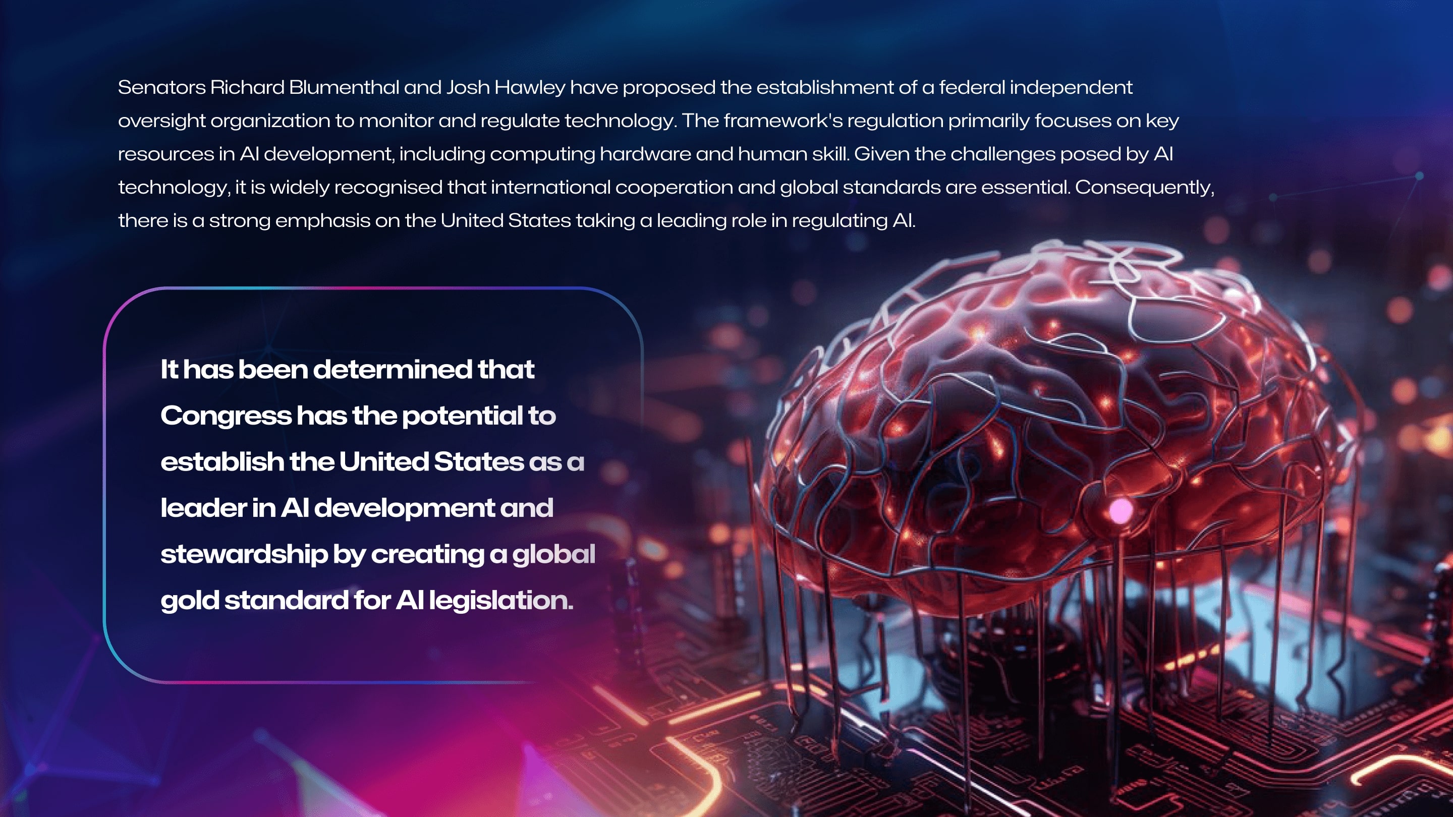 Senators Richard Blumenthal and Josh Hawley have proposed the establishment of a federal independent oversight organization to monitor and regulate technology. The framework's regulation primarily focuses on key resources in AI development, including computing hardware and human skill. Given the challenges posed by AI technology, it is widely recognised that international cooperation and global standards are essential. Consequently, there is a strong emphasis on the United States taking a leading role in regulating AI. It has been determined that Congress has the potential to establish the United States as a leader in AI development and stewardship by creating a global gold standard for AI legislation.