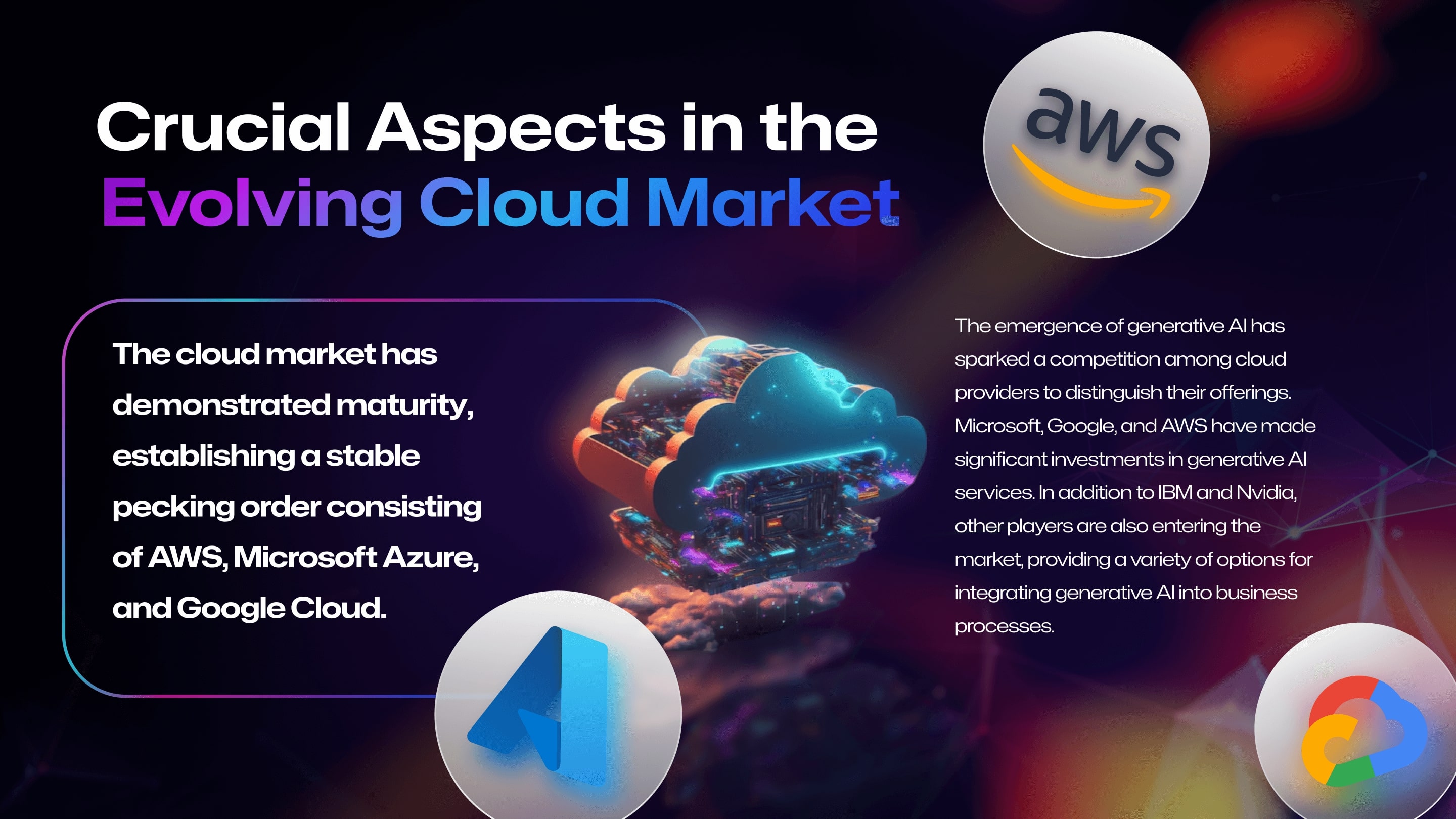 The cloud market has demonstrated maturity, establishing a stable pecking order consisting of AWS, Microsoft Azure, and Google Cloud. The emergence of generative AI has sparked a competition among cloud providers to distinguish their offerings. Microsoft, Google, and AWS have made significant investments in generative AI services. In addition to IBM and Nvidia, other players are also entering the market, providing a variety of options for integrating generative AI into business processes.