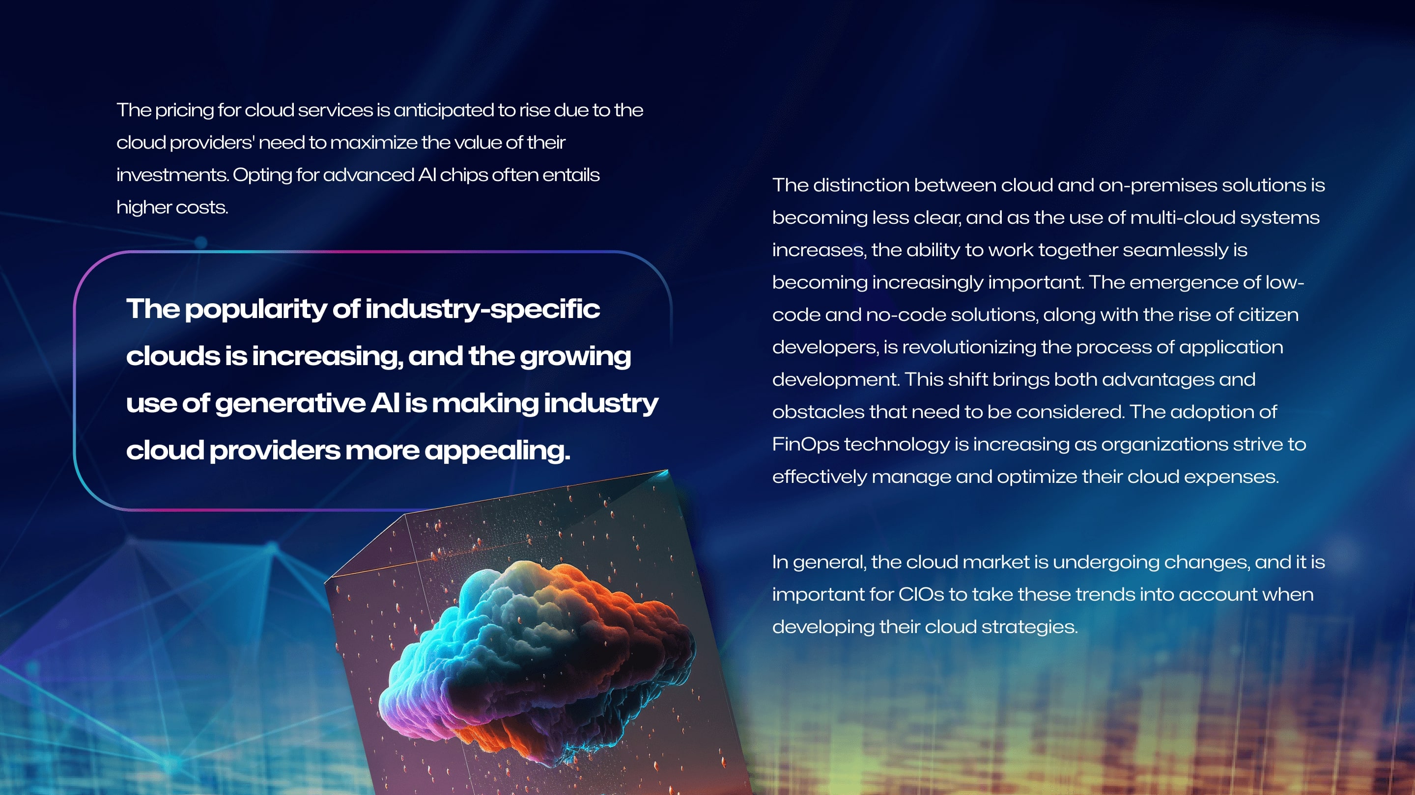 The pricing for cloud services is anticipated to rise due to the cloud providers' need to maximize the value of their investments. Opting for advanced AI chips often entails higher costs. The popularity of industry-specific clouds is increasing, and the growing use of generative AI is making industry cloud providers more appealing. The distinction between cloud and on-premises solutions is becoming less clear, and as the use of multi-cloud systems increases, the ability to work together seamlessly is becoming increasingly important. The emergence of low-code and no-code solutions, along with the rise of citizen developers, is revolutionizing the process of application development. This shift brings both advantages and obstacles that need to be considered. The adoption of FinOps technology is increasing as organizations strive to effectively manage and optimize their cloud expenses.